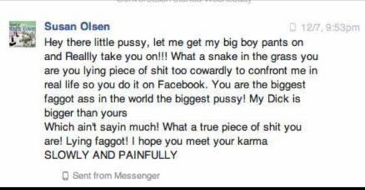 She wrote, “Hey there little p*ssy, let me get my big boy pants on and really take you on! What a snake in the grass you are, you lying piece of sh*t. Too cowardly to confront me in real life so you do it on Facebook. You are the biggest f*ggot ass in the world, the biggest p*ssy!”