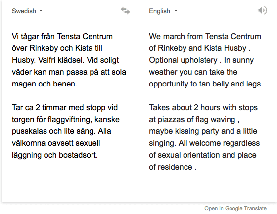 Gay pride parades in Europe generally don’t go anywhere near Muslim areas, for obvious reasons. In Nørrebro, Copenhagen (where only 30% of the population are Muslim, as opposed to the 70% in the Swedish areas), gay pride parades learned the hard way not to tread within Islamic strongholds. Formerly, there was a large gay pride parade that went through Nørrebrogade (the main high street of the area). Gays would take stones to the head every year from Muslims, so they re-routed. If gays are attacked in an area that’s only 30% Muslim, just imagine what will happen in an area that’s 70% Muslim. There is a 100% chance that the gays marching through Tensta and Husby will be attacked, maybe even fatally – and, when they’re attacked, feminists and gay rights activists will be siding with the Muslims who are attacking them. – blazingcatfur.ca