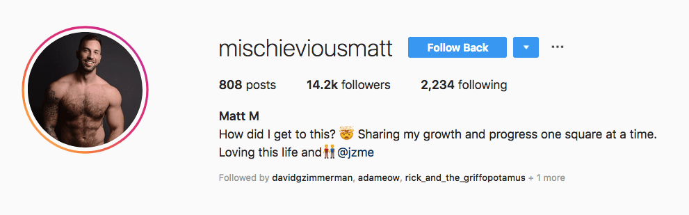Matt M . mischieviousmatt . Damn!  See this is how it is done.  We love seeing that option to follow back and oh … we … did ! Is this you getting dressed or undressed for us? We'd vote for being in the same room for either activity. We did spend some time one-handedly scrolling through your Instagram and did see you actually were in DNA Magazine!