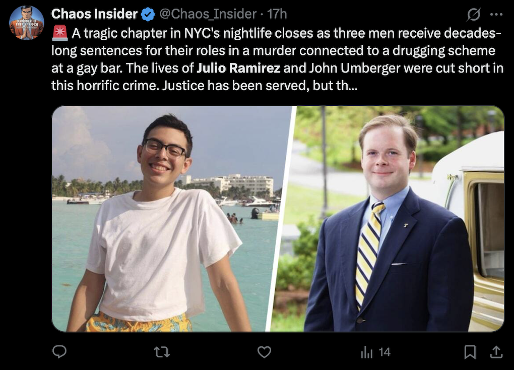 A night out in New York City’s vibrant Hell’s Kitchen district — known for its gay bars and nightlife — turned tragic in 2022 when two men, Julio Ramirez and John Umberger, were drugged, robbed, and murdered in what prosecutors described as a calculated and cruel scheme.