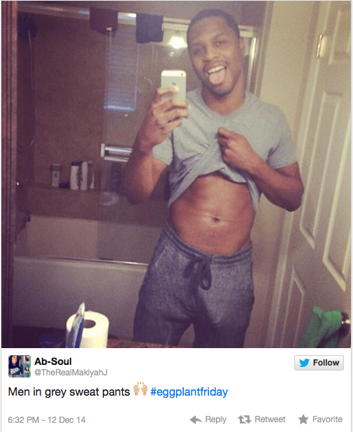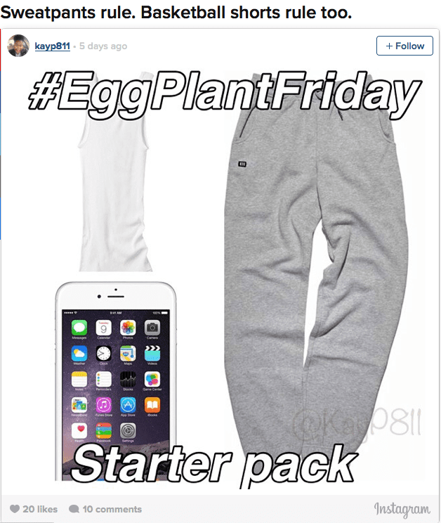 What do you need to participate in #EggPlantFriday? Well from the pic below it seems sweat pants, gym shorts, a smartphone, maybe a tank top, and an unmentionable … an egg plant. Of course, when they say egg plant, they're not talking about something from the produce section and most likely something this white male from New England or any region of the country has, no matter what clothing I wear. Something for the black community to share (gay or straight), but for all of us to enjoy? And I am not sure if they sweat pants need to be grey or not. I'll need to do some more research. Weekly research.