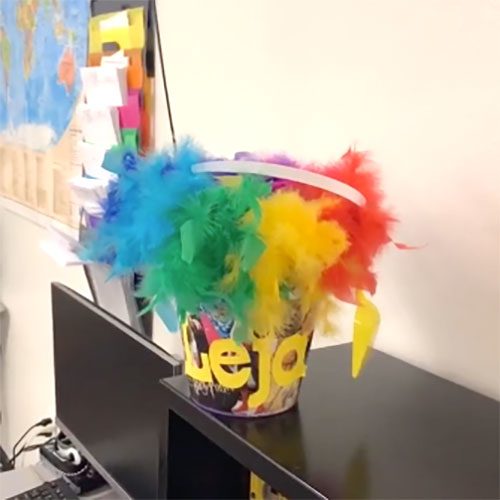 And so, even without putting a traditional Pride flag on display, Leja found a way to make her perspective known whether through lots of rainbow lettering on banners, rainbow feathers in her pencil jar, rainbow ducttape to spread desks or a rainbow face mask during the coronavirus.
