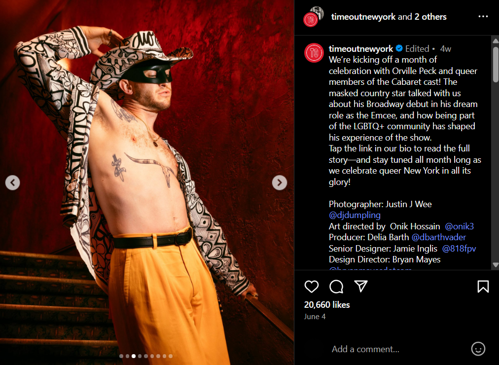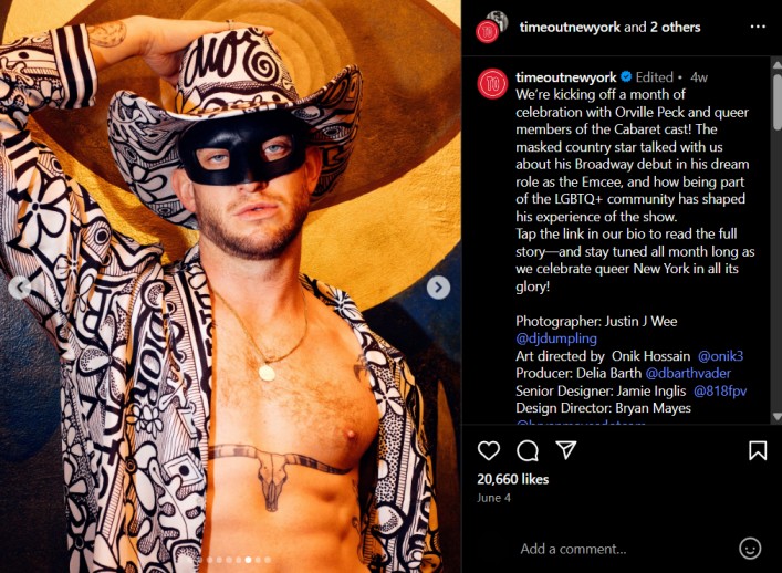 For someone known for hiding behind a mask, Peck is peeling back more layers than ever—both in art and in abs. Whether he’s haunting Broadway, crooning beside queer icons, or casually redefining cowboy thirst traps, Orville Peck is still doing it his way: beautifully, brazenly, and very, very gay.