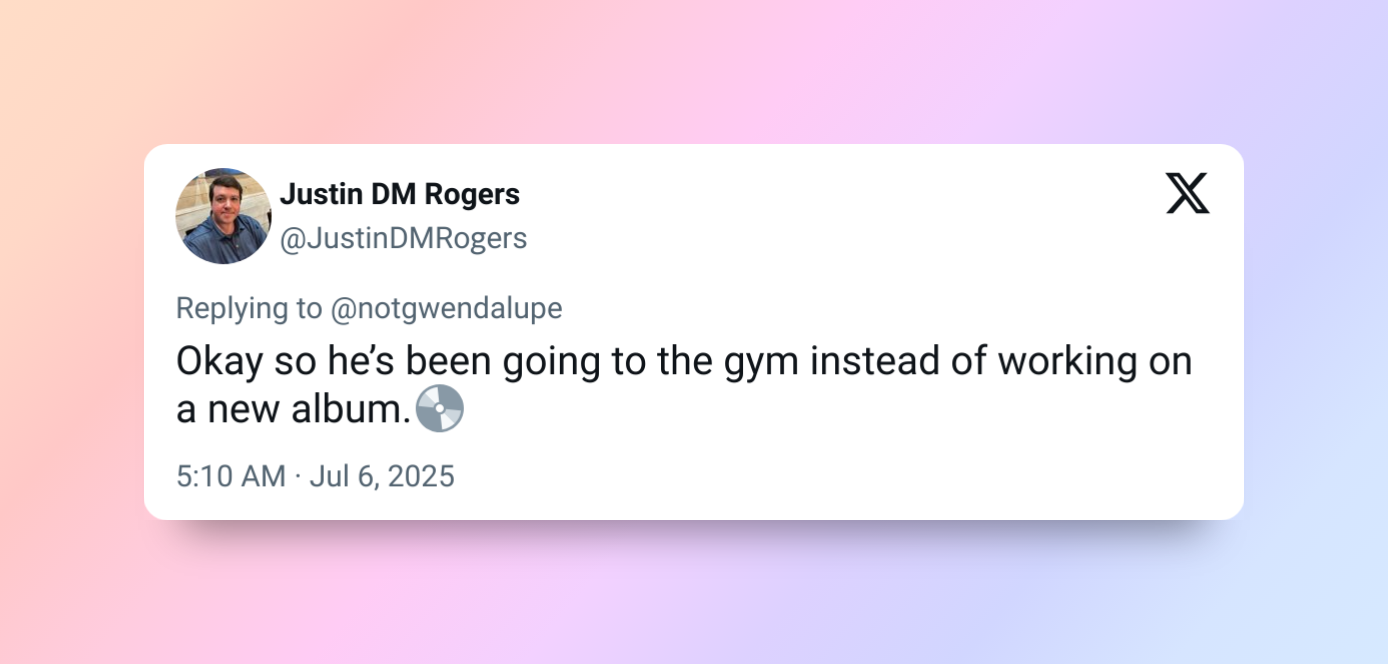 “Okay so he’s been going to the gym instead of working on a new album.”