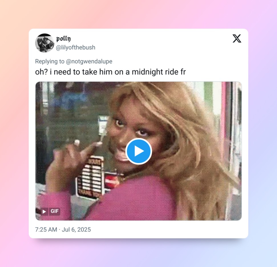 “I need to take him on a midnight ride fr,” and, predictably chaotic: