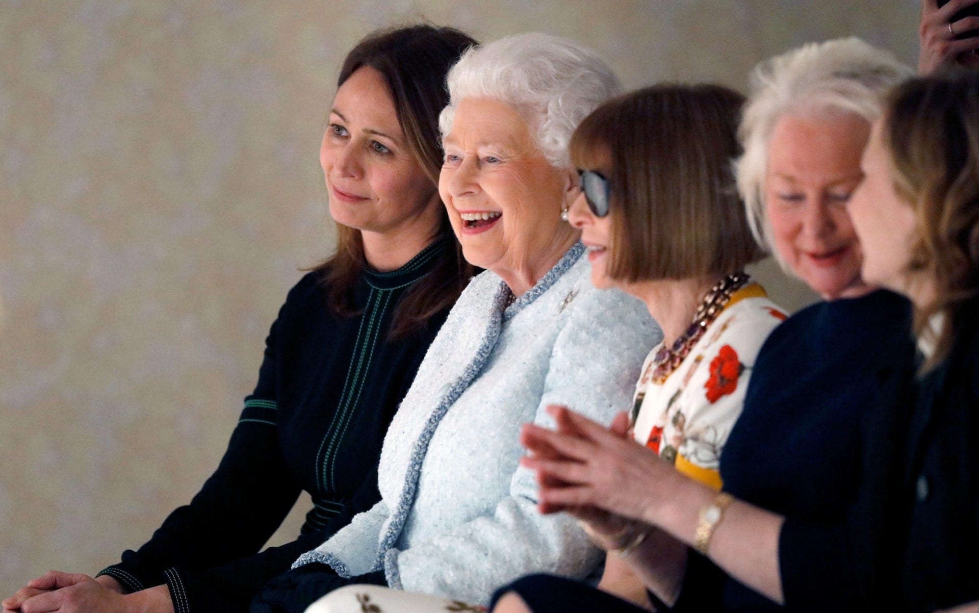 The head of the British Monarchy sat front row with Wintour in a blue Angela Kelly suit, with crystal embellishments, as she watched the runway show from upcoming designer Richard Quinn, whose designs on the catwalk were inspired by Her Majesty's own headscarves.