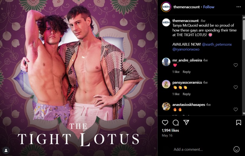 Produced by Men.com (aka the Criterion Collection of homoerotic absurdity), The Tight Lotus stars adult film veterans Seth Peterson and Ryan Orion. A cheeky promo on Instagram proclaimed, “Tanya McQuoid would be so proud of how these guys are spending their time at The Tight Lotus.” Rest in paradise, Tanya. You would have eaten this up.