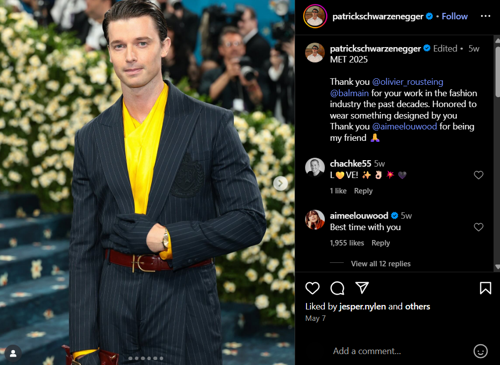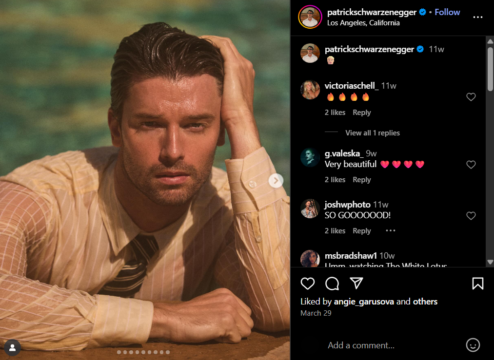 But don’t let the “Arnold’s kid” thing fool you—Patrick’s no legacy puppet. He studied business at USC (thanks to dad’s advice about actors who didn’t understand finances), starred in Gen V and The Staircase, and continues to sharpen his craft with weekly theater classes. He’s no slouch. He’s just got better abs than most of us.