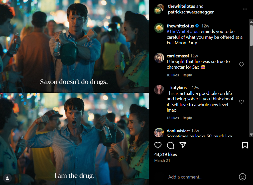 But back to the real Saxon. When Schwarzenegger landed the role, he clocked the energy immediately. “I was a little nervous to take on another douche role and have to live up to their hype,” he said, referencing Season 1’s Jake Lacy and Season 2’s Theo James. For the record, he absolutely did. Saxon was all sculpted smugness, spiritual bypassing, and overpriced yoga mats. And yet… kind of hot?