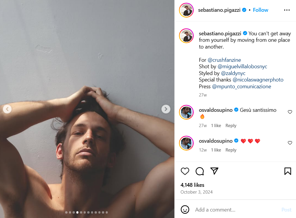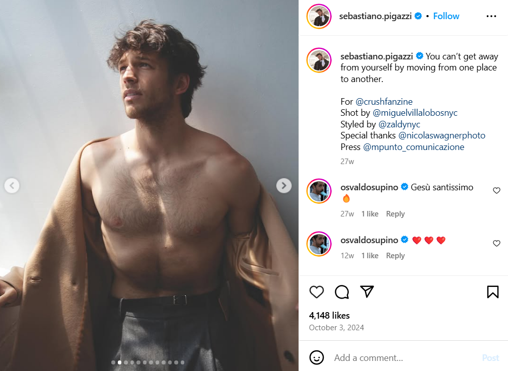 Well, Sebastiano — spoiler alert — you didn’t. You delivered the type of presence we didn’t even know we were missing. Whether he’s sparking new conversations about masculinity on screen, blending vintage pajama sleeves into couture, or simply reciting Neruda like it’s pillow talk, Sebastiano Pigazzi is proof that vulnerability is sexy, poetry still matters, and queer romance doesn’t have to be tragic or campy — it can be beautifully, unbearably human.