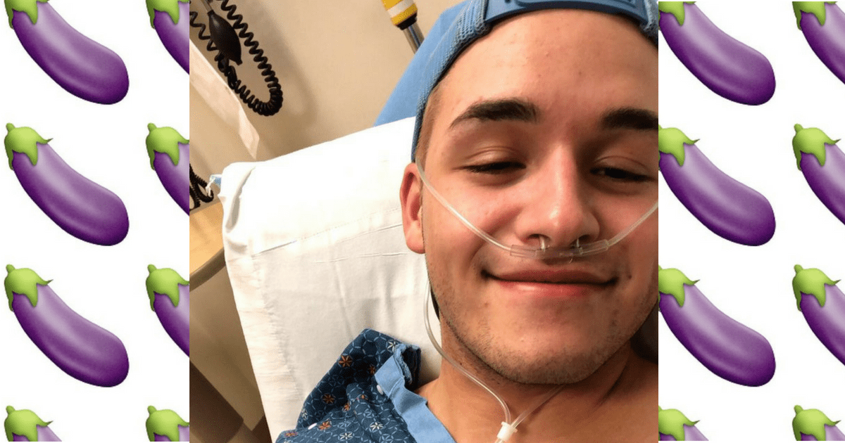 Here’s a story that brings new meaning to “taking it like a champ”. 19-year-old Freddy Alanis from the Chicago suburbs is getting lots of attention after he posted a photo of him in the ER after he reportedly went down on a guy with a massive 10-inch penis. Are you gagged? He was, apparently!