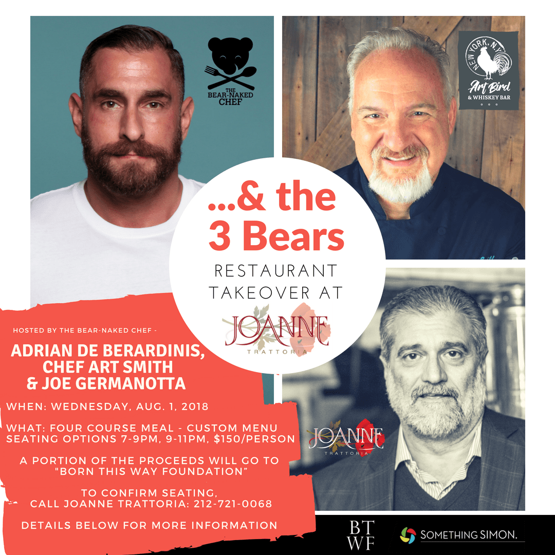 That is what is going down this Wednesday, when Adrian De Berardinis (The Bear-Naked Chef), Chef Art Smith (James Beard Award-winner) and Joe Germanotta (restaurateur and all-around amazing dude) will be hosting an incredible culinary event called … & the 3 Bears” Restaurant Takeover at Joanne Trattoria in the Upper West Side of New York City.