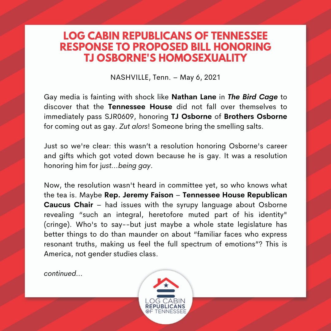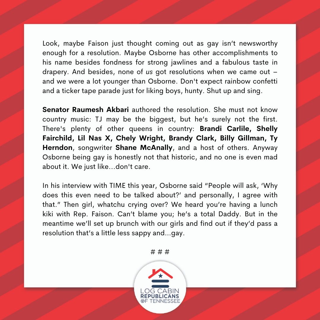 The Twitter statement goes on to name other “queens” in country music after denigrating Osborne by saying, “T.J. may be the biggest, but he surely is not the first.” The statement concludes with the Log Cabin Republicans of Tennessee’s adulation for Faison: