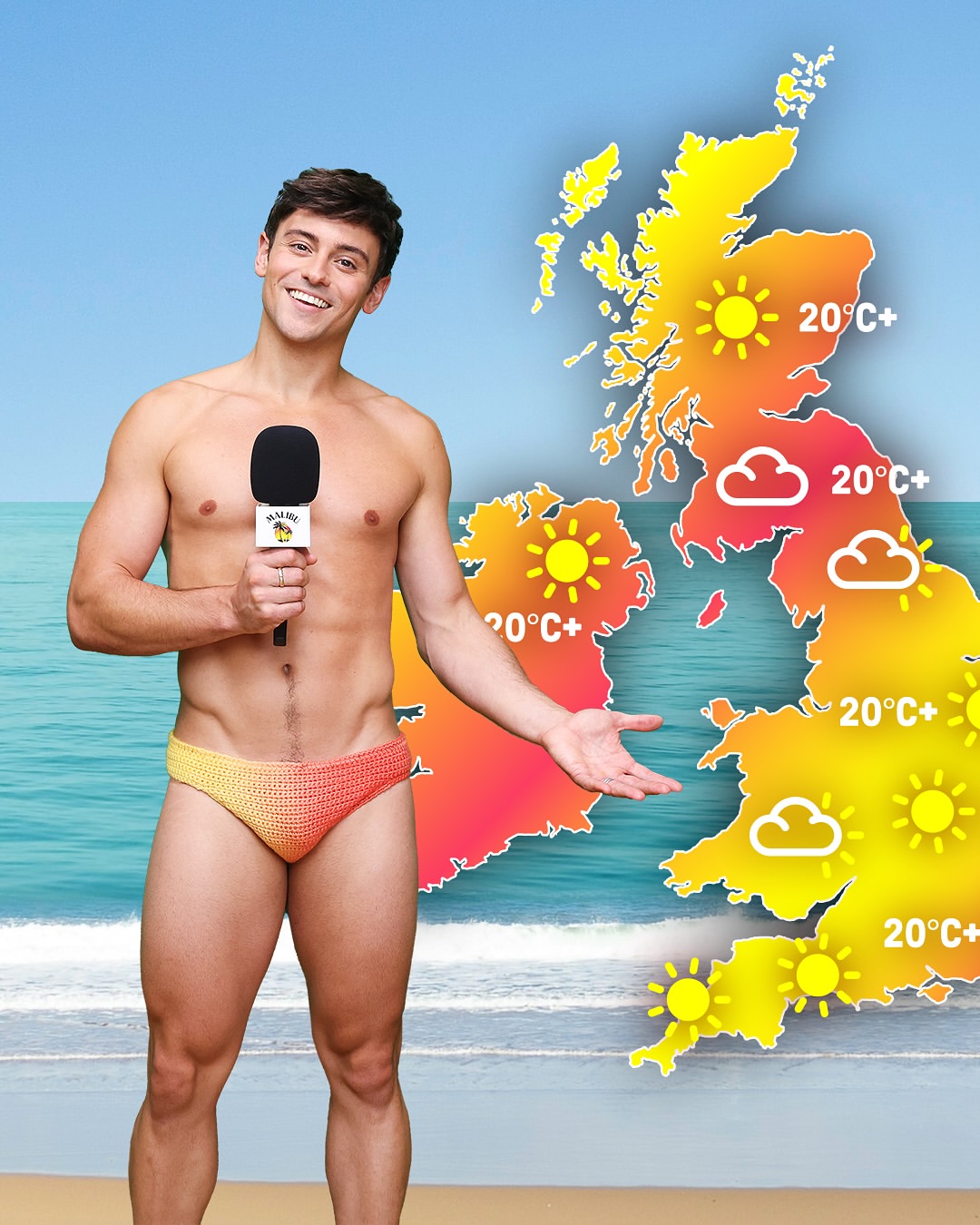 But despite the soaking, Tom remained in full presenter mode, ready to dish out weather forecasts for his hometown of Plymouth. “Temperatures will be staying in the 70s, it should be a very Plymouth day,” he said, giving us all the warm, nostalgic vibes of a childhood spent beachside. And for anyone with plans to swim, he wisely added: “If the weather is nice in your area and you end up by a beach or pool, remember, do not drink and dive.”