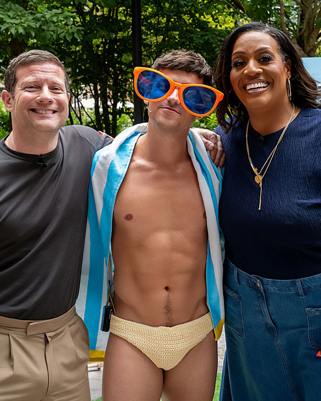After a chat about his post-diving life (including a mysterious reference to Celebrity Traitors that left us all intrigued), Tom took his weather prediction duties to the next level. Sporting a vibrant, eye-catching rain jacket that practically screamed “ready for a downpour,” he proceeded to strip off—first the jacket, then the pants—revealing himself in nothing but his iconic Olympic-worthy abs and a pair of snug underwear. Because why not?