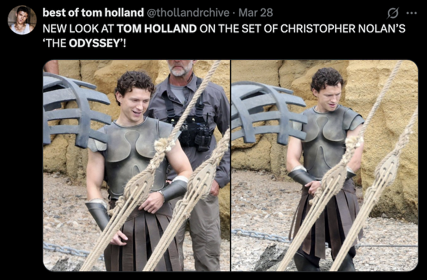 And because the universe loves us, Tom is also about to grace the screen again—this time as part of a mega A-list cast including his fiancée Zendaya, Anne Hathaway, Lupita Nyong’o, Matt Damon, Charlize Theron, and Robert Pattinson in Christopher Nolan’s highly anticipated epic The Odyssey, set to release in 2026. Yes, that Odyssey. Homer could never.