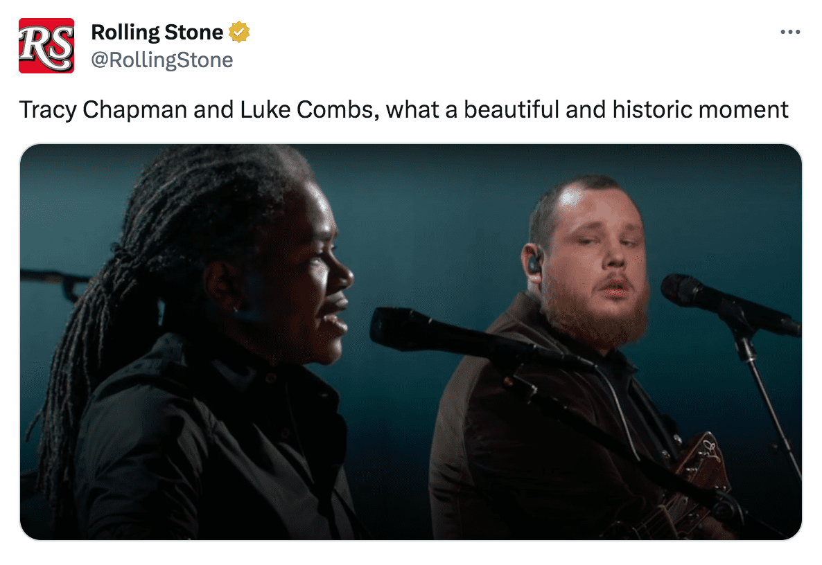 In case you didn’t get to see it, here is the full video of Tracy Chapman and Luke Combs singing “Fast Car” at the Grammys