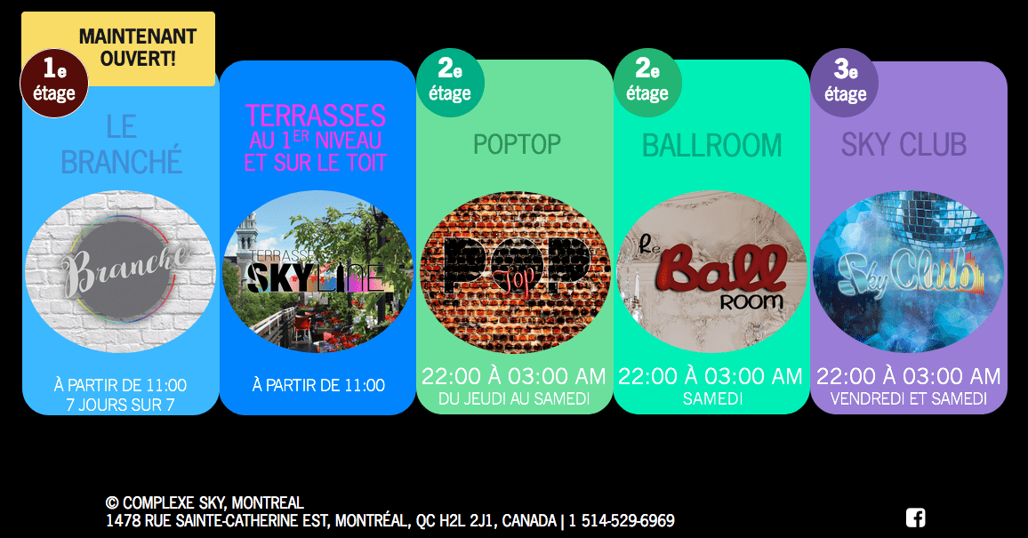 Complexe Sky – This has been an institution for some time and the design has changed over the years. The dance spaces have altered their appearance, but the "complex" seems to be in a great growing flux with a roof top space which includes a pool. It's worth checking out day and night.