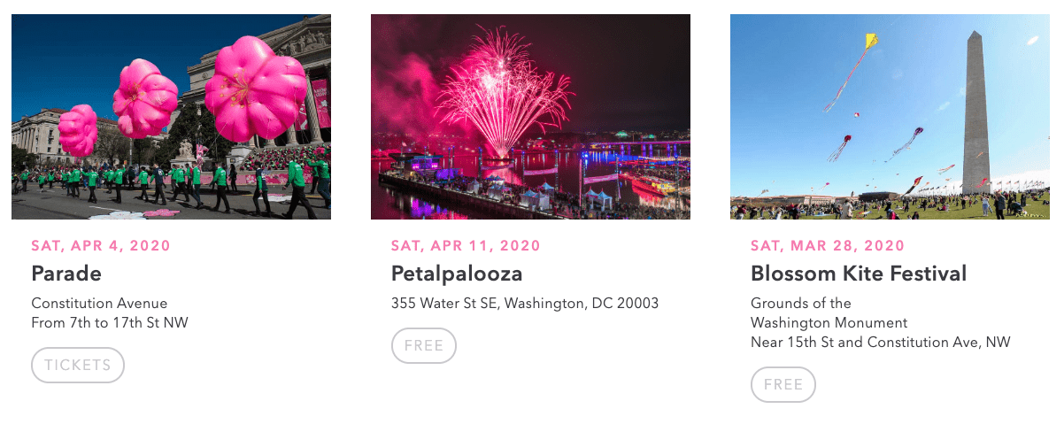 Here are some of the events for this year. To stay on top of the schedule and options, keep an eye on https://nationalcherryblossomfestival.org/events/ .