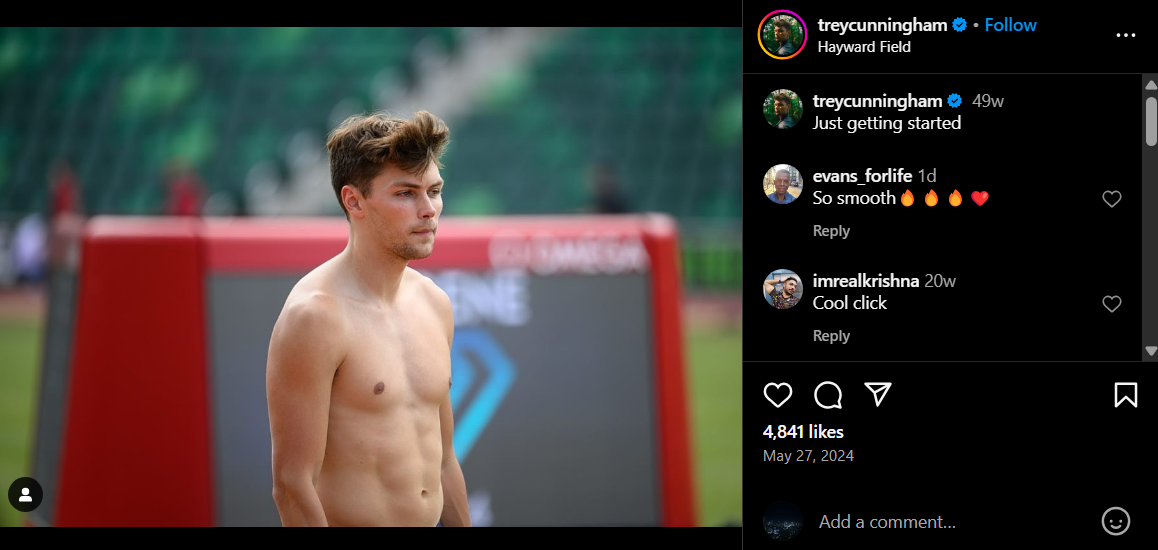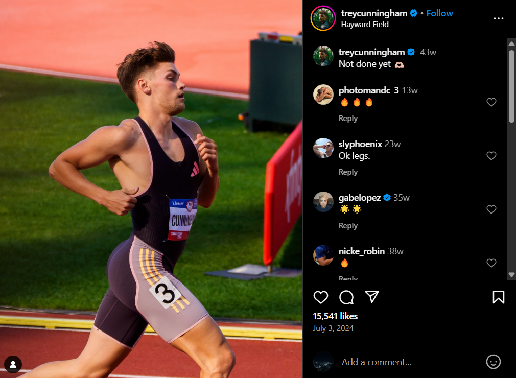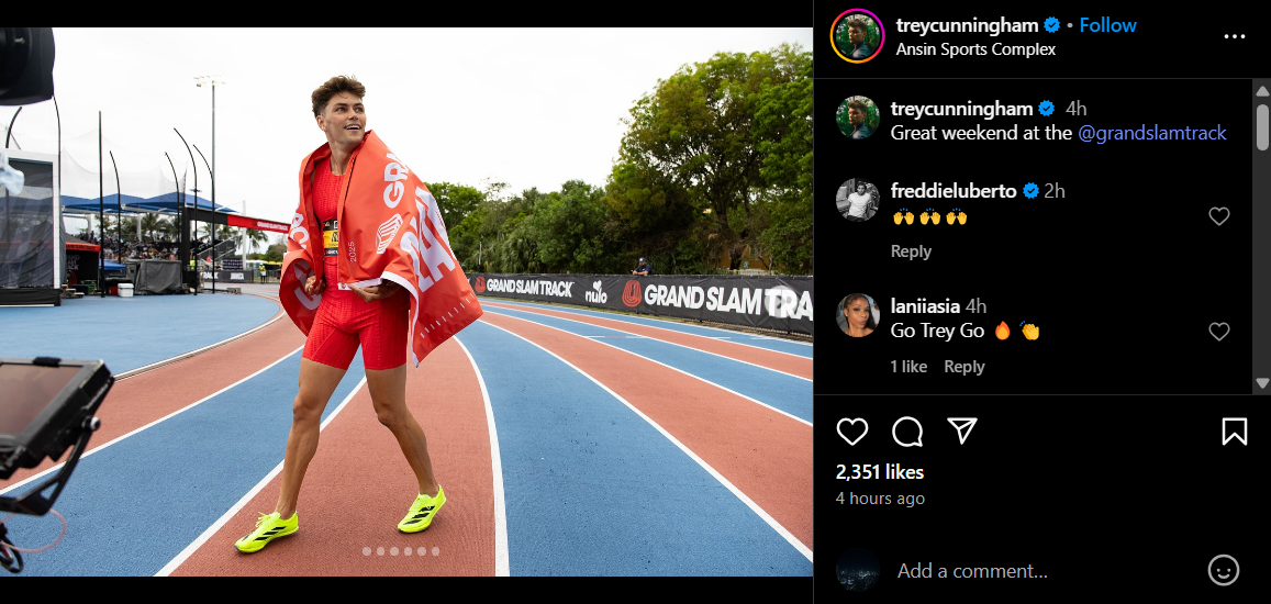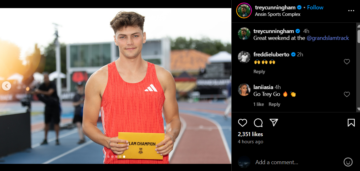 In a sport that sometimes feels like it’s sponsored by beige compression gear and underwhelming post-race interviews, Cunningham brings color. Not just in identity, but in style, in wit, in joy. On Instagram, Grand Slam Track teased, “Is Trey Cunningham track’s new lover boy?”—to which we say: absolutely, and don’t stop asking.