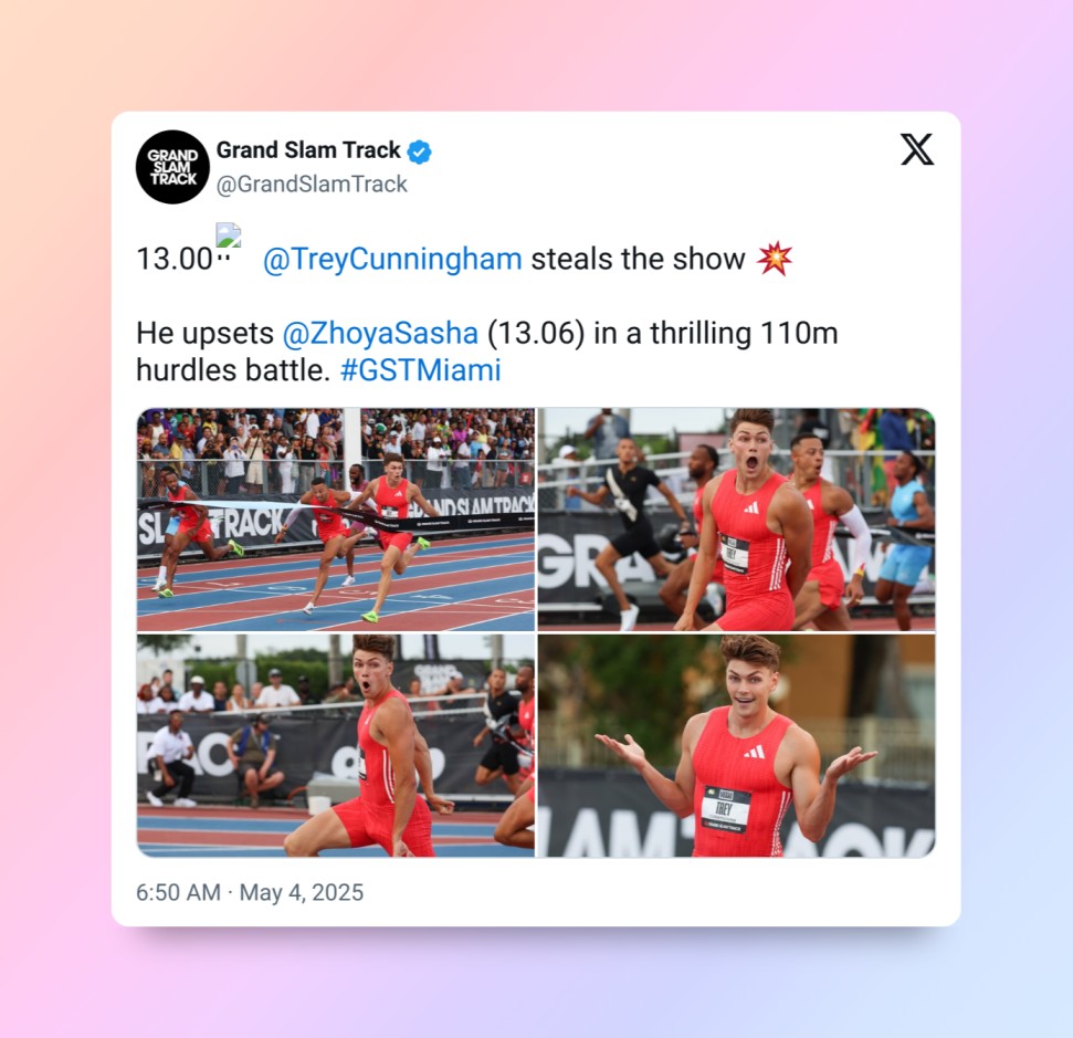 This past weekend in Miami, Cunningham didn’t just show up—he shut it down. He took home the top spot in the 110-meter hurdles at the Grand Slam Track meet with a personal best of 13.00 seconds. Then he decided, why not? Let’s win the 100-meter sprint too. Another personal best. “OK, I just won both of the events. I won the 110-meter hurdles with a PB and then I also PBed in the 100. So, I’m a sprinter too,” he deadpanned post-race, clearly delighted with himself—and frankly, who could blame him?
