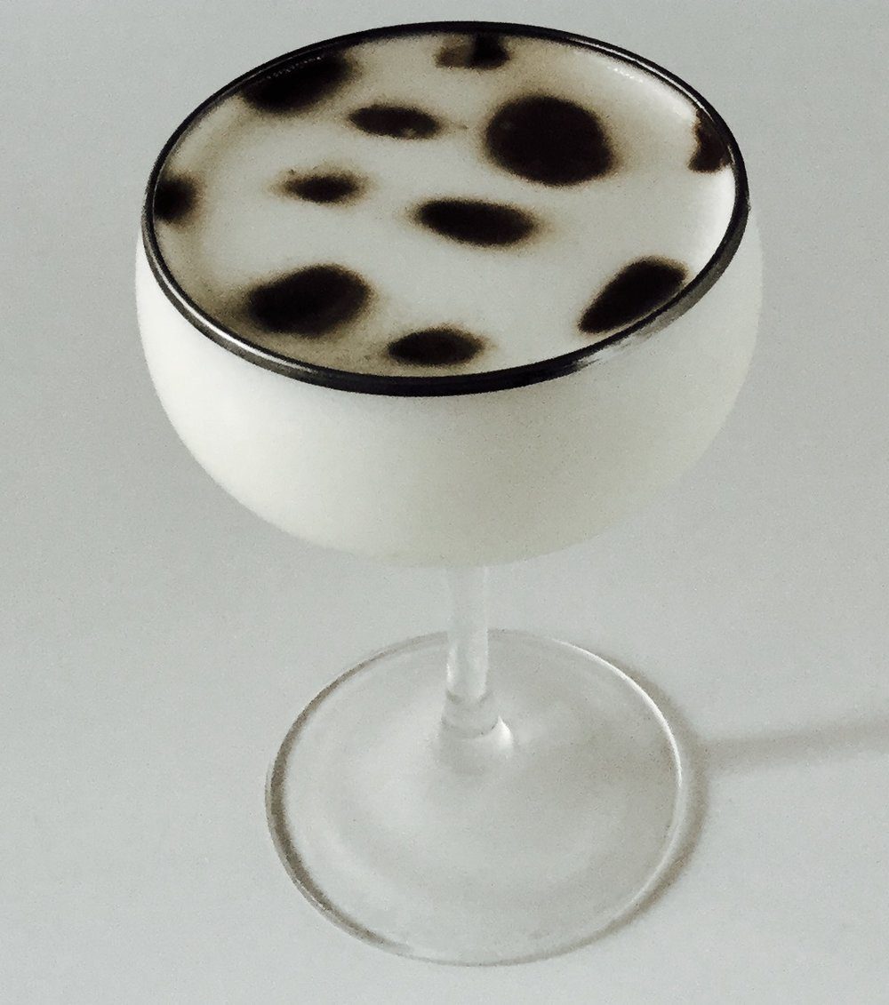 Crack an egg and separate the yolk out and drop the egg white in your shaker tin. Next, measure and pour all other ingredients in the tin. Then without ice dry whip all ingredients in a circular whipping motion for 5-10 seconds. Add ice and shake vigorously for 10-15 seconds. The tin should be frosty and very cold to the touch. Next, double strain with a Hawthorne and fine strainer out all the ingredients catching any ice chips into a chilled coupe glass. Lastly, drop on or spray some Scrappy’s Aromatic bitters (mixed with Activated Charcoal tablets making the bitters very black) with a stencil making 9-10 Dalmatian spots! Serve and enjoy!
