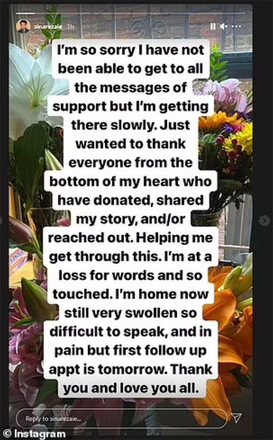 In a post to his Instagram account, Rezaie thanked his friends and followers for the many get-well messages he’s received and added he is now at home recuperating.
