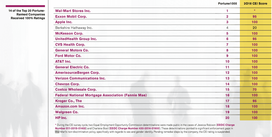 “Walmart has previously received high marks on the CEI, but recent determinations by the EEOC about discrimination are cause for concern,“ Deena Fidas, director of the Human Rights Campaign’s workplace equality program, said in an emailed statement. “The CEI is not just focused on policy, but on the daily workplace experience of LGBTQ employees. We have suspended Walmart’s score at this time as they address these concerns."