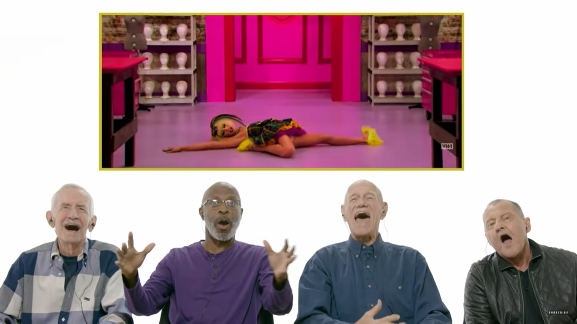 But what are they reacting to this time? Drag. Yes, it appears that the “old gays” Bill, Jessay, Robert, and Mick were put together to watch iconic clips from Drag Race (in what is a thinly veiled advertisement, but we’ll accept the video anyway). Seeing as Jessay has done drag before, we are pretty interested in seeing what he has to think. Though, it’s Robert who summarized the whole experience poignantly.
