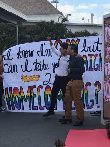 Pineda, who is straight and the captain of the football team, was pleasantly surprised when he walked out to lunch on Thursday to see crowds of students lined up waiting for him to make his way down a long corridor that lead to a huge closet that read “Out of the Closet”. Next to it, his friend Alexander who appeared from behind a colorful and vibrant sign that read “I know I’m GAY, but can I take you STRAIGHT 2 HOMECOMING?”
