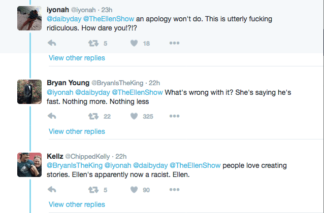 I could see it as racist but if it was one of the typical fat walfare black people then I'd call racist 100%. I don't like Ellen but I just see this as a "I can get stuff done fast" by having a piggy back on the fastest man alive post. People just need to see the fun instead of trying to find hate.