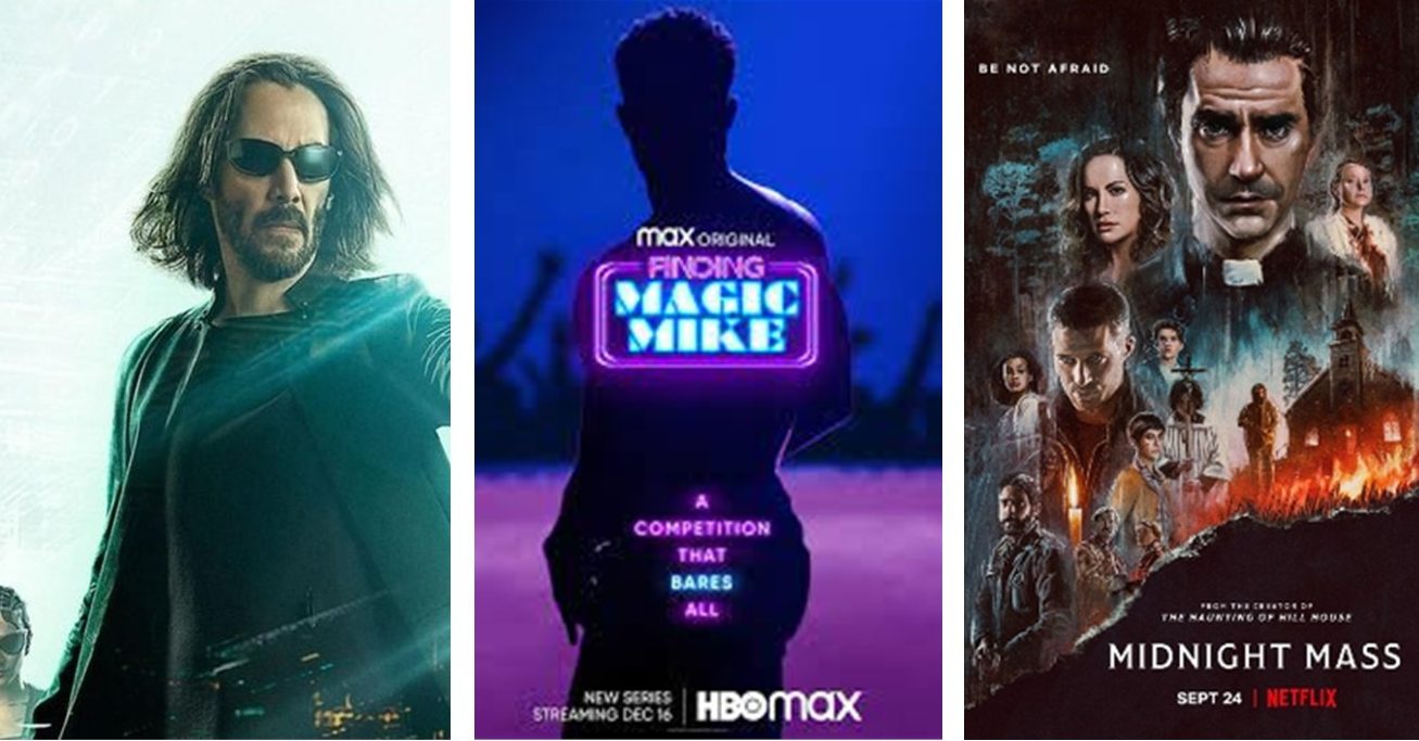 Being home with mom and dad for the holiday season was a treat, but when they go to bed at 9:00 pm and you’re in the middle of nowhere and the nearest established gay population is a 3-hour drive away, you fire up the streaming options and you start to binge.  So what was on my list to view? I had to finally get to Midnight Mass, Finding Magic Mike, and not so much a binge but a must watch movie – The Matrix Resurrections.