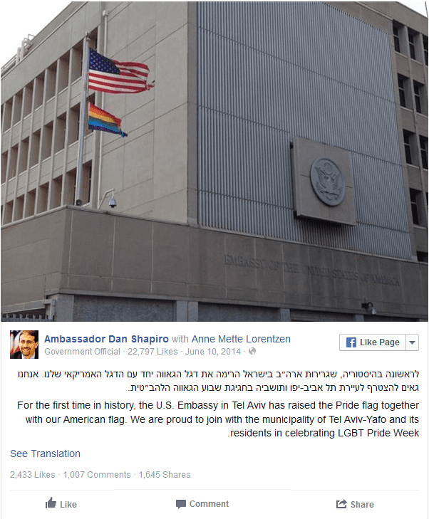 “For the first time in history, (2014) the U.S. Embassy in Tel Aviv has raised the Pride flag together with our American flag,” U.S. Ambassador to Israel Dan Shapiro posted on Facebook Tuesday. “We are proud to join with the municipality of Tel Aviv-Yafo and its residents in celebrating LGBT Pride Week.” – theblaze.com (2014)