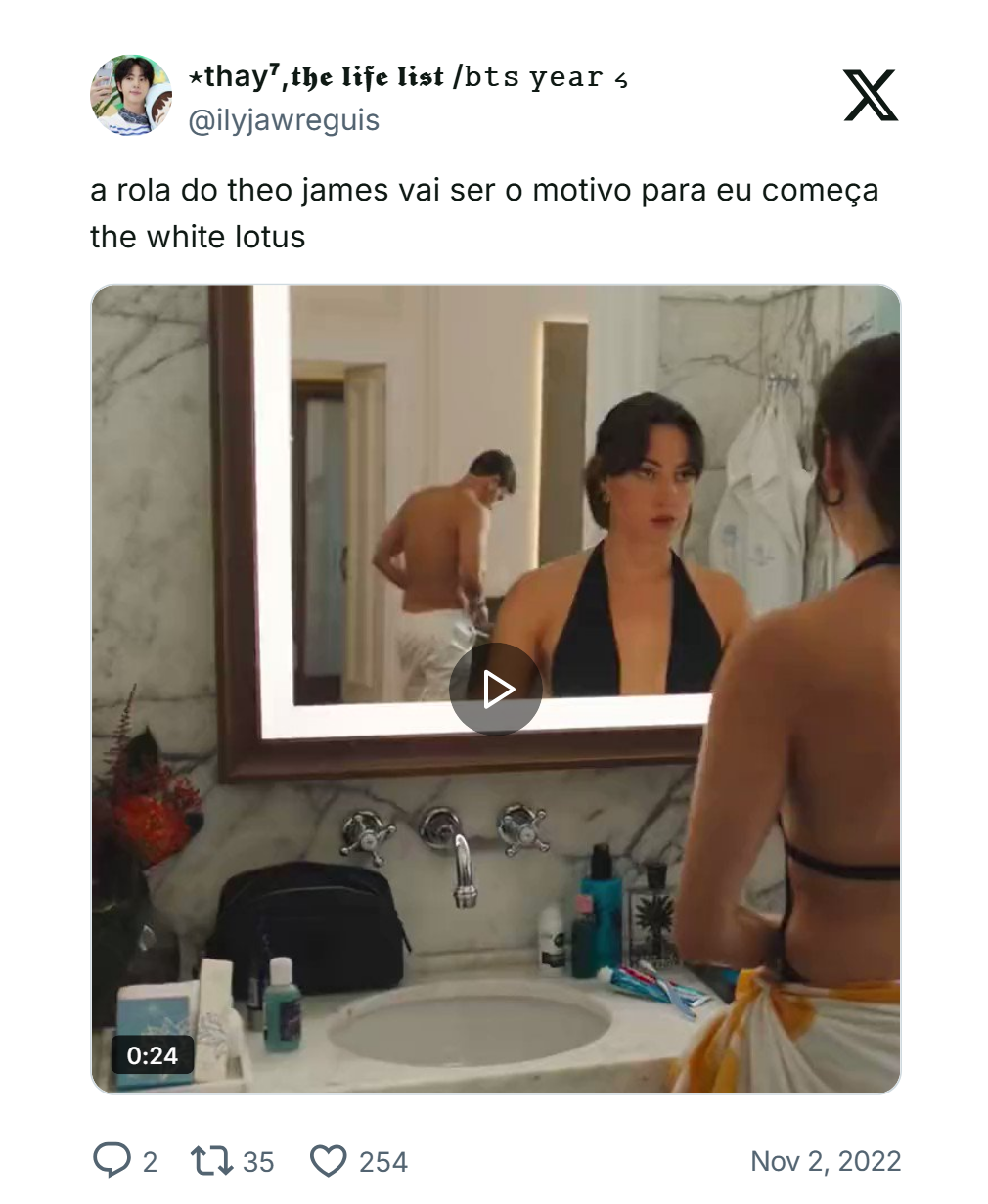 Then, of course, there’s Theo James in Season 2 — the man, the myth, the prosthetic. In one memorable moment, his character’s impressive appendage becomes a plot device, creating palpable tension between characters as one Aubrey Plaza’s Harper Spiller stumbles upon it mid-disrobing. The Internet did not disappoint, as this particular scene promptly went viral, further cementing The White Lotus’ status as the ultimate “water cooler” TV experience.