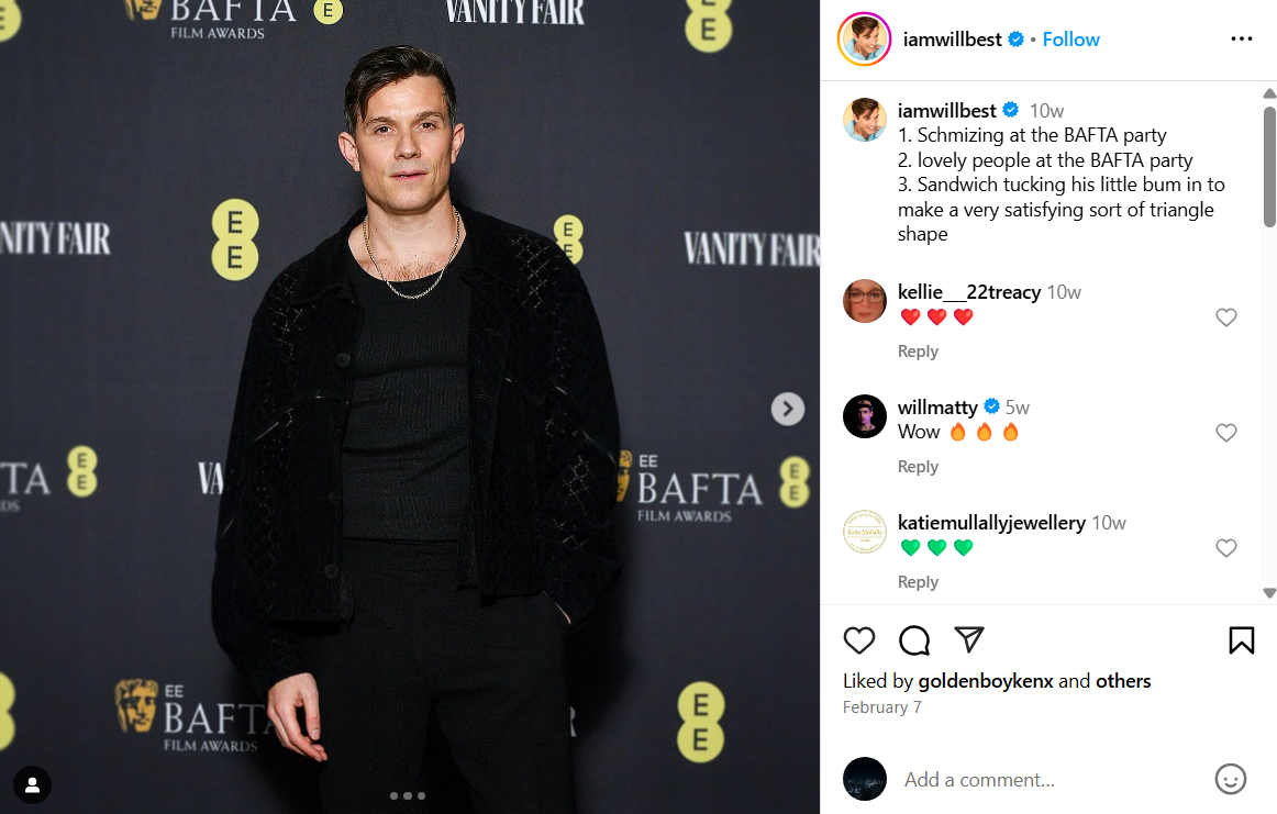 But what really makes him catnip for the queer gaze? It’s not just the looks (though, yes, jawline for days). It’s the cheeky confidence. The slight camp. The wink that says “I see you, babes” without ever crossing into try-hard territory. British gays love him because he’s fit, flirty, and gives just enough chaos to feel like the hot guy in your friendship group who’s way too comfortable being adored. Will Best is hot, but also… knows he’s hot to us. He flirts with the fourth wall, and the gays? We live for it.