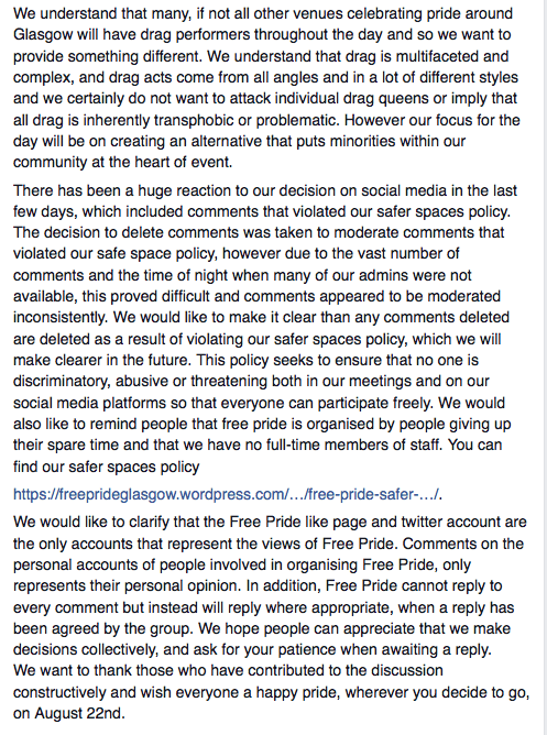 “Pride Glasgow believes that any community group should be given their place to flourish but that success should not be built on the negativity and ignorance towards other events, groups and like minded people and we are saddened to see that this is the direction that Free Pride has chosen to take.”