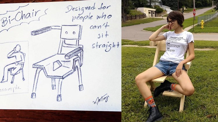 “So, an artist named Má Matiazi drew this awesome sketch “The Bi-Chair: for people who can’t sit straight,” Israel Walker wrote on Facebook. “My daughter (who identifies as bisexual genderfuck) thinks that her and other LGBTQ+ folks inability to sit “normally” is hilarious. So I asked Má if I could make my own rough style of Bi-Chair and she said yes!”