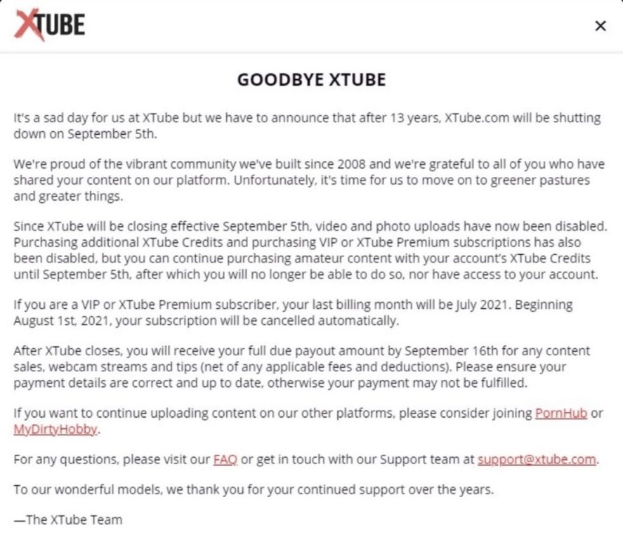 “Like any tech company, we are constantly evaluating our content offerings and products to best serve our users. XTube has always had a dedicated but small community, and we believe that its users and creators will be better served on one of our existing platforms, where they will be able to take advantage of wider reach and increased visibility.”