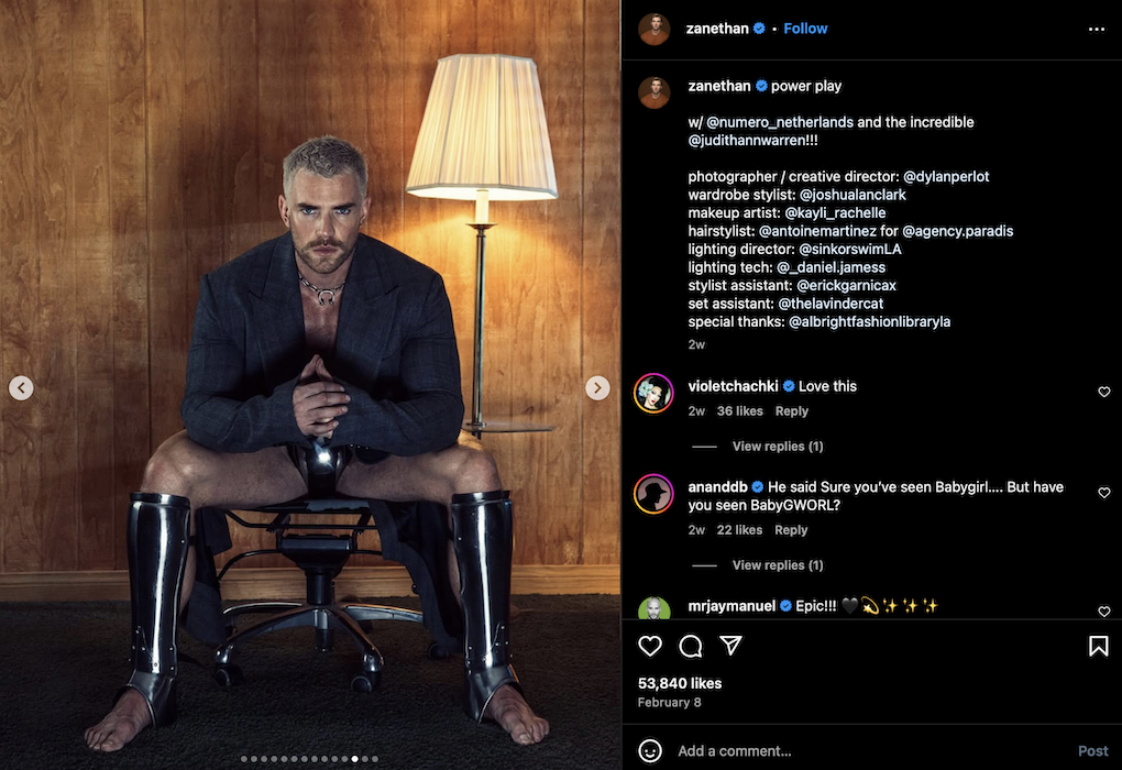 Joined by the enigmatic Judith Ann Warren, Phillips took things to a whole new level, exuding equal parts dominance and submission in a spread that left fans (and probably a few mortals) utterly breathless. With his platinum locks and a wardrobe that screamed “leather daddy,” Zane embodied the ultimate muse—one who knows how to serve both smoldering intensity and effortless cool.